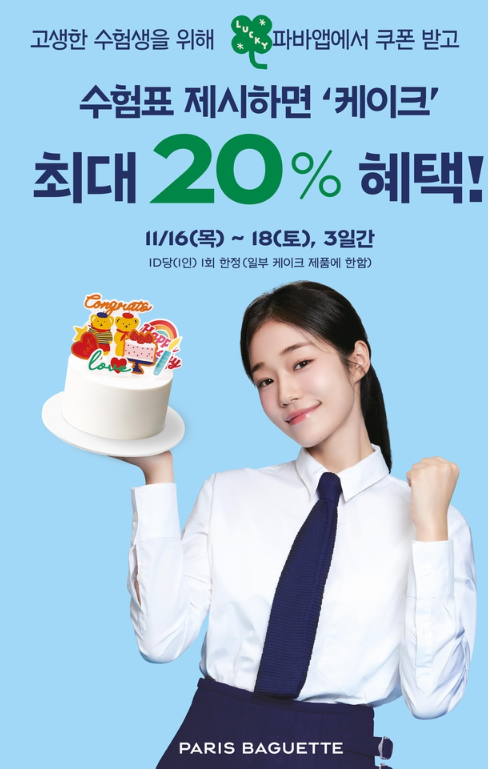 파리바게트 앱에서 행사 쿠폰을 다운로드 후, 매장에서 수험표와 함께 사용하면 최대 20%까지 할인된 가격으로 케이크를 구매하실 수 있습니다.